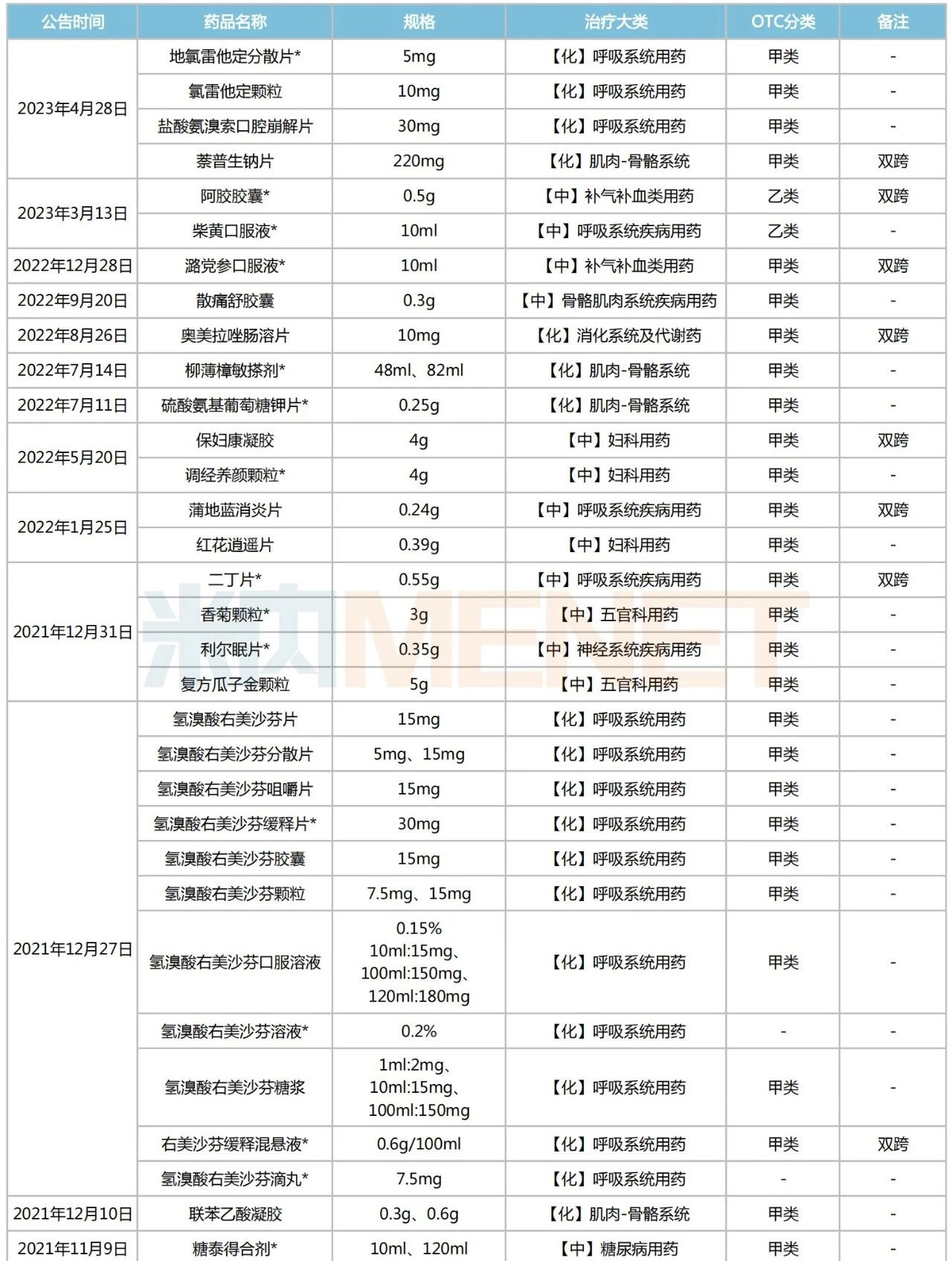 2021年至今,NMPA一共发布了25则处方药转OTC药的公告,合计54种药品(以产品名称统计),包括盐酸氨溴索口腔崩解片、阿胶胶囊、潞党参口服液、奥美拉唑肠溶片、蒲地蓝消炎片、小儿七星茶颗粒、布地奈德鼻喷雾剂、金振颗粒等。按有关要求,这些药品无需处方即可通过零售渠道出售。