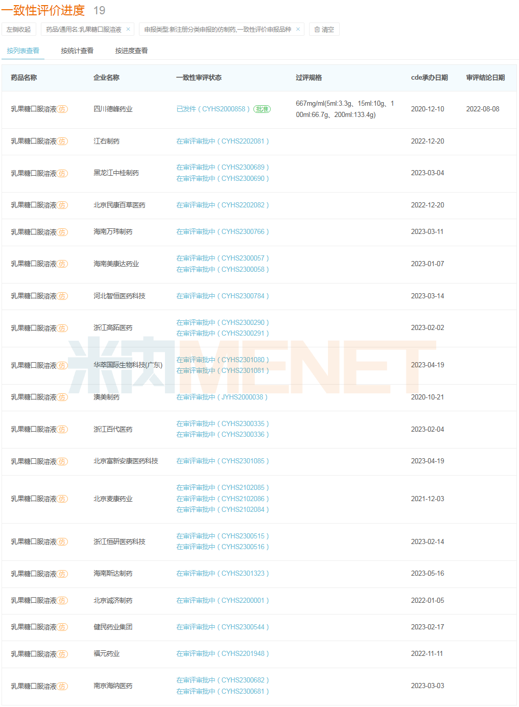 目前,暂无企业提交乳果糖口服溶液一致性评价补充申请,但已有19家企业以新注册分类提交该产品上市申请,其中四川德峰药业的产品获批上市并视同过评,为国内首家。不难发现,部分儿童常用处方药经过系统评价后转为OTC药,患儿及其家属的购药便利性能得到一定提升,也有利于布局该类产品的企业开拓零售市场。