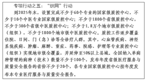 按照《计划》要求,“织网”行动将在2025年末,将质控工作全面覆盖住院、日间、门(急)诊等全诊疗人群,在心血管疾病、神经系统疾病、肿瘤、麻醉、重症等关键领域实现地级市全覆盖,并延伸至50%以上县域。全国纳入单病种管理的病种(技术)数量不少于100个。