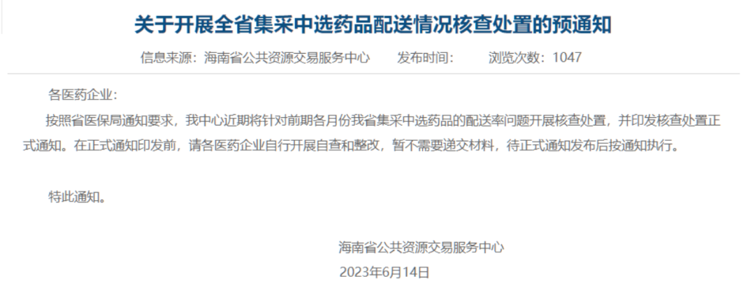 6月14日,海南省医保局表示,要针对前期各月份集采中选药品的配送率问题开展核查处置。