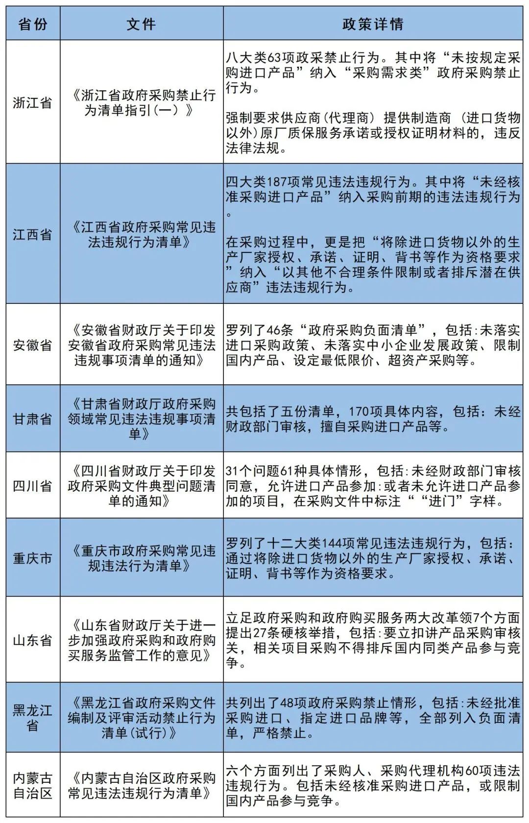 截至目前,浙江、安徽、江西等全国多省已相继发布通知,把限制国产设备采购,纳入负面清单,着重强调政府采购应当采购本国产品。一场席卷全国的进口设备采购限制风暴拉开帷幕。