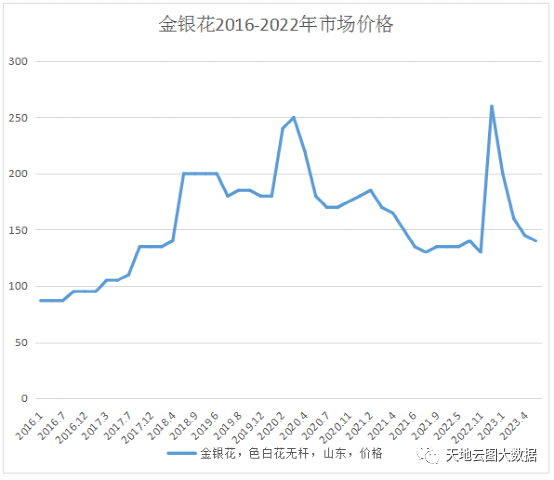 从历史价格走势来看,2017年是金银花价格开始恢复的年份,山东产区苗木退化,河北在地面积不大,山东、河北、河南三大产区总产量在1万吨左右,而冬季的流感流行又加大了需求,推动行情一路上行,于2018年达到高位;再加上当时正好是扶贫攻坚战的最后几年,政府有补贴,使得这三年金银花行情上行,种植面积扩大。