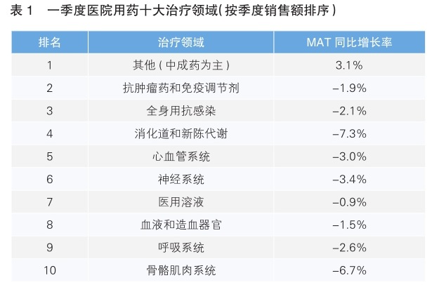 综观各大治疗领域,中成药在医院市场的销售占比仍然位列第一,季度销售额同比增长8.4%,其MAT年销售额同比增长3.1%,增速位列所有品类第一。医用溶液季度增速位列第二,季度销售额同比增长7.6%,其MAT年销售额同比下降0.9%。抗肿瘤药和免疫调节剂的季度销售额仍居市场第二位,但季度增速表现欠佳,季度销售额同比下降0.7%,MAT年销售额同比下降1.9%(详见表1)。