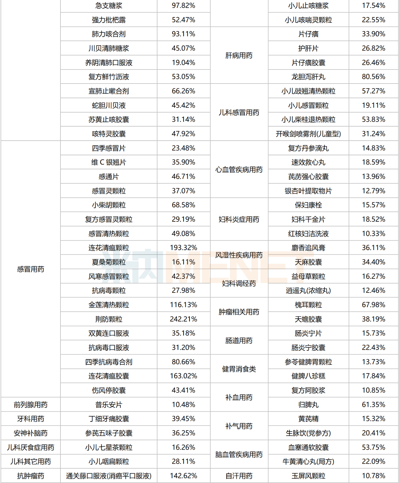 从增长率看,金鸣片、金银花口服液、荆防颗粒、连花清瘟颗粒、连花清瘟胶囊、金水宝片、通关藤口服液(消癌平口服液)、蓝芩颗粒、金莲清热颗粒9个品种同比增长均超100%。
