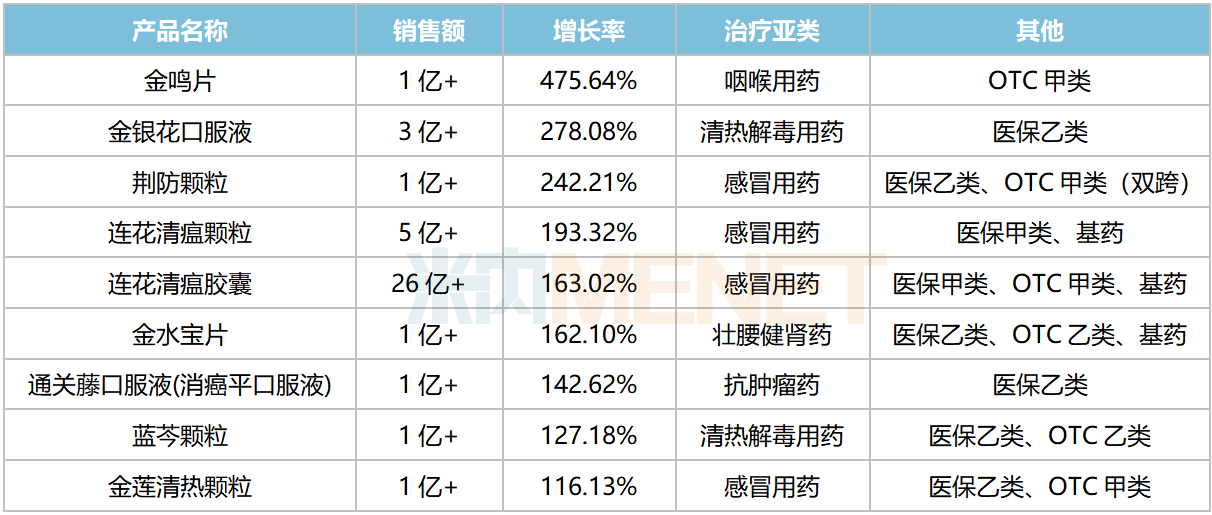 9个为翻倍式增长(增速超过100%),包括金鸣片(山东宏济堂制药)、金银花口服液(真奥金银)、荆防颗粒、连花清瘟颗粒(以岭药业)、连花清瘟胶囊(以岭药业)、金水宝片、通关藤口服液(消癌平口服液)、蓝芩颗粒及金莲清热颗粒(宁夏启元国药)。