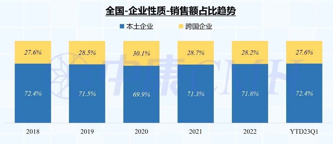 分不同企业来看,本土企业在2023Q1销售额占比已达72.4%,回升至2018年水平,跨国企业份额占比27.6%。