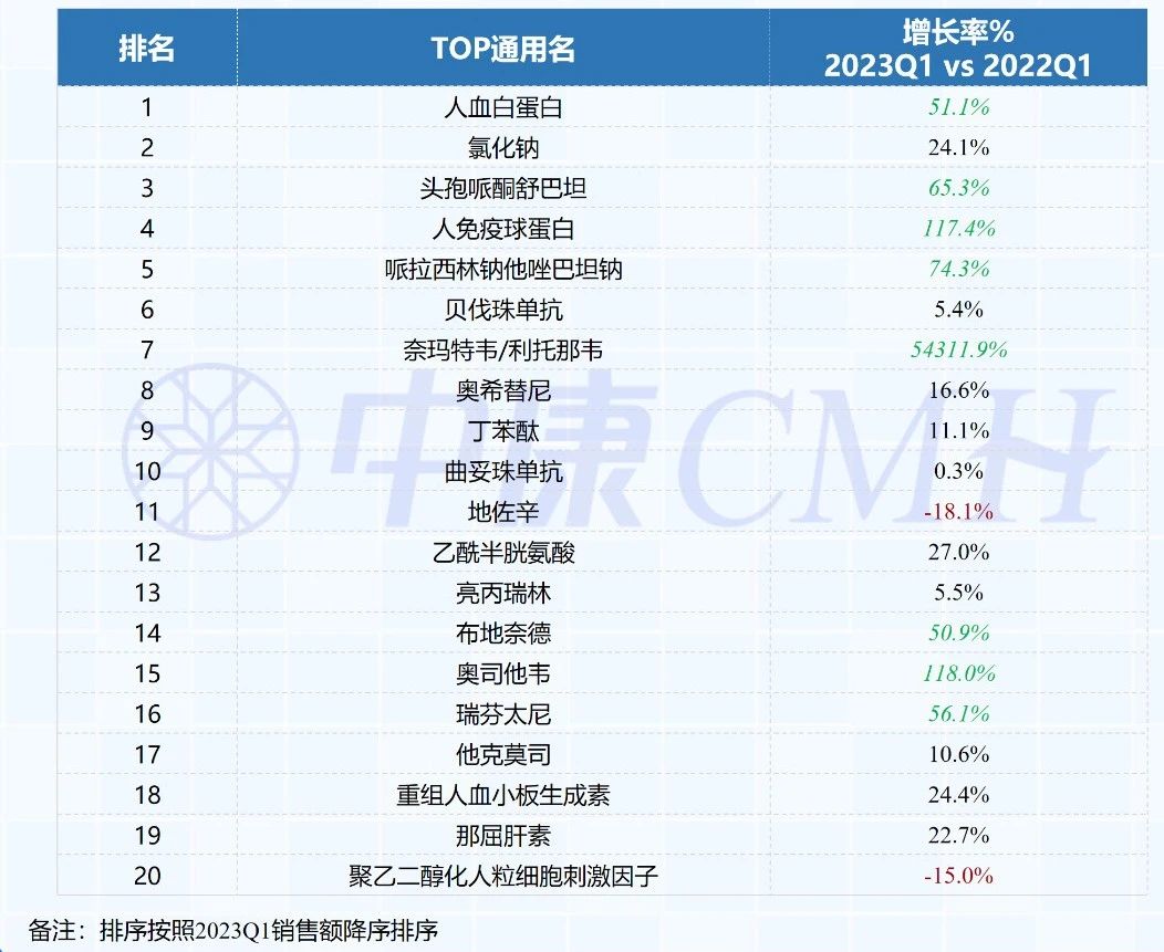 从ATC分类来看,2023Q1销售额排名前三的治疗领域为抗肿瘤药和免疫机能调节药、系统用抗感染药、血液和造血器官用药,销售额同比增速分别为2.4%、41.8%、19.9%。