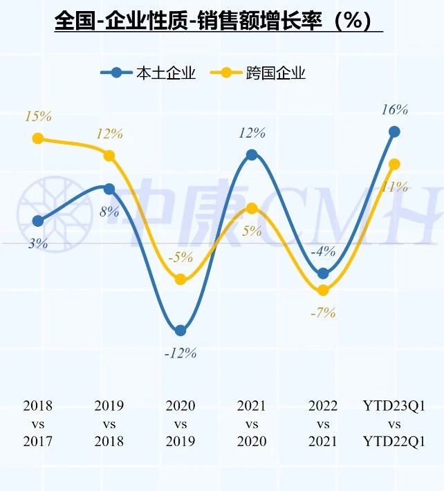 与去年第一季度相比,本土企业和跨国企业2023年第一季度销售额同比均有所回升,增速提高到双位数水平,其中本土企业增长相对领先,为16%,跨国企业增长11%。