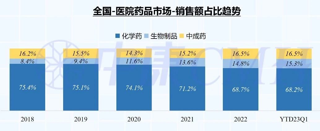 自2019年集采制度执行以来,化学药在医院市场销售份额占比逐年下滑,由2018年的75.4%下滑至2023Q1的68.2%;同时,生物制品销售份额不断提升,从2018年的8.4%上涨至2023Q1的15.3%;中成药占比相对稳定,其2023年Q1占比为16.5%。