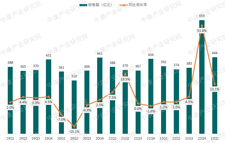 图1:2019Q1-2023Q1零售市场中成药销售额与同比增长率