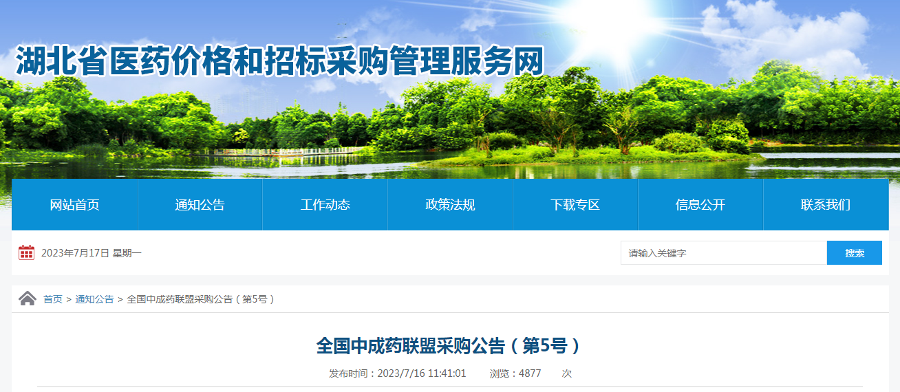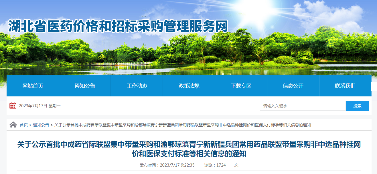 7月17日,湖北省医药价格和招标采购管理服务网发布《关于公示首批中成药省际联盟集中带量采购和渝鄂琼滇青宁新新疆兵团常用药品联盟带量采购非中选品种挂网价和医保支付标准等相关信息的通知》,按首批中成药集采的相关规定,非中选品种的医保支付标准按中选品种平均降幅(42%)下调。