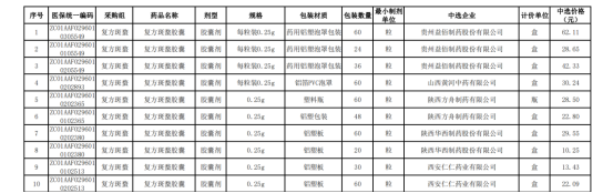 此外,本次文件重点公布了中选企业非报价代表品中选价格。以复方斑蝥胶囊为例,贵州益佰除了60粒规格,还有36粒、24粒两种规格,价格分别为42.33元、28.65元;陕西方舟48粒22.8元;陕西华西20粒10.25元;西安仁仁60粒22.09元。山西黄河中药则仅有60粒规格,于4号文件公布价格30.24元。