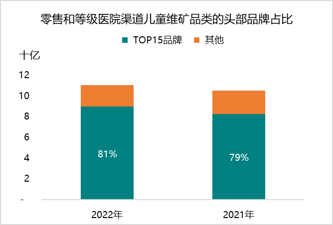 数据显示,在零售和等级医院终端渠道,儿童维矿补充剂TOP15品牌在2022年占总市场的81%,头部集中效应明显,且相比2021年集中度进一步提升。