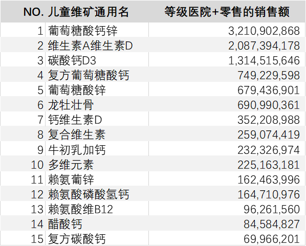 其中,葡萄糖酸钙锌在等级医院和零售渠道的销售额达到32亿,与第二名的维生素AD相比相差12个亿,第15名仅有TOP1的2.2%。