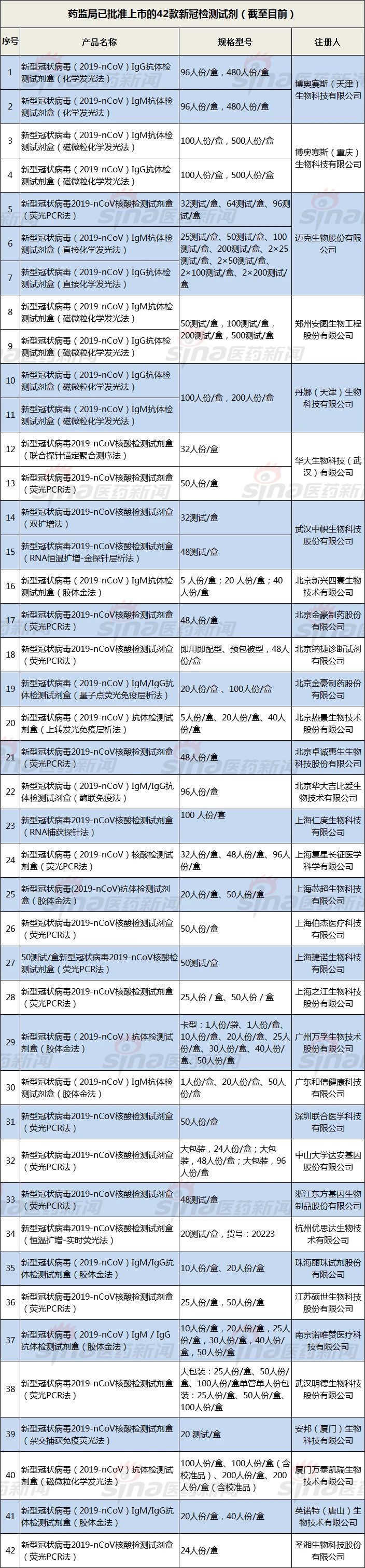 目前,国家药监局已批准上市的新冠检测试剂共有42款,涉及到的上市公司包括华大基因(300676)、达安基因(002030)、迈克生物(300463)、明德生物(002932)、复星医药(600196)、硕世生物(688399)、万孚生物(300482)、东方生物(688298)……此外,还有正在冲刺科创板的圣湘生物等企业。