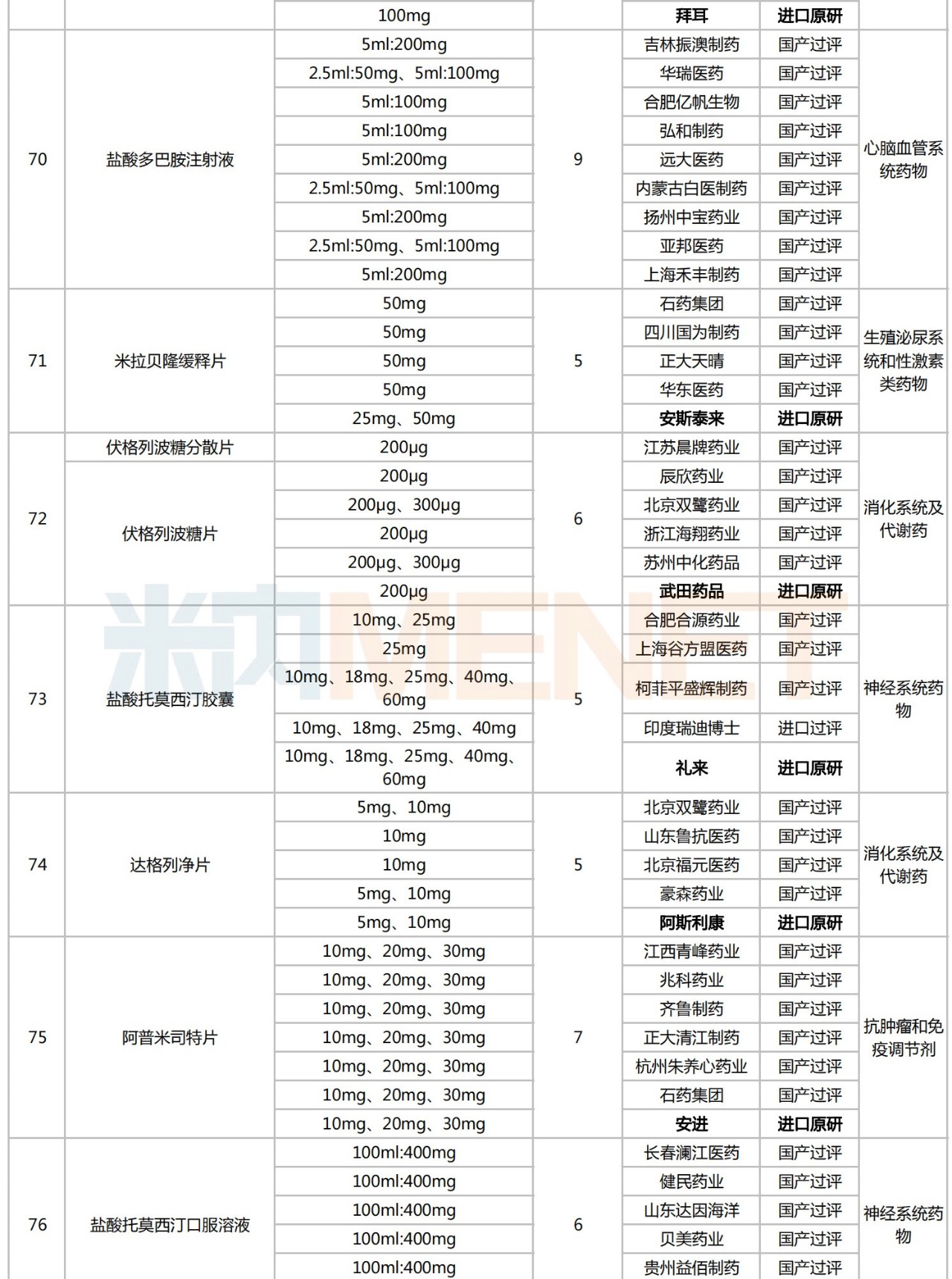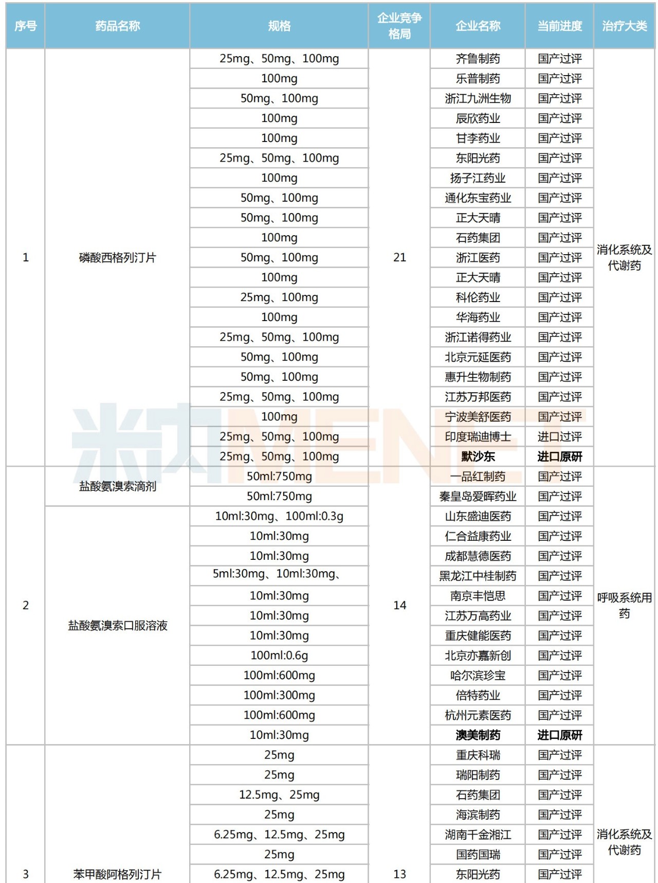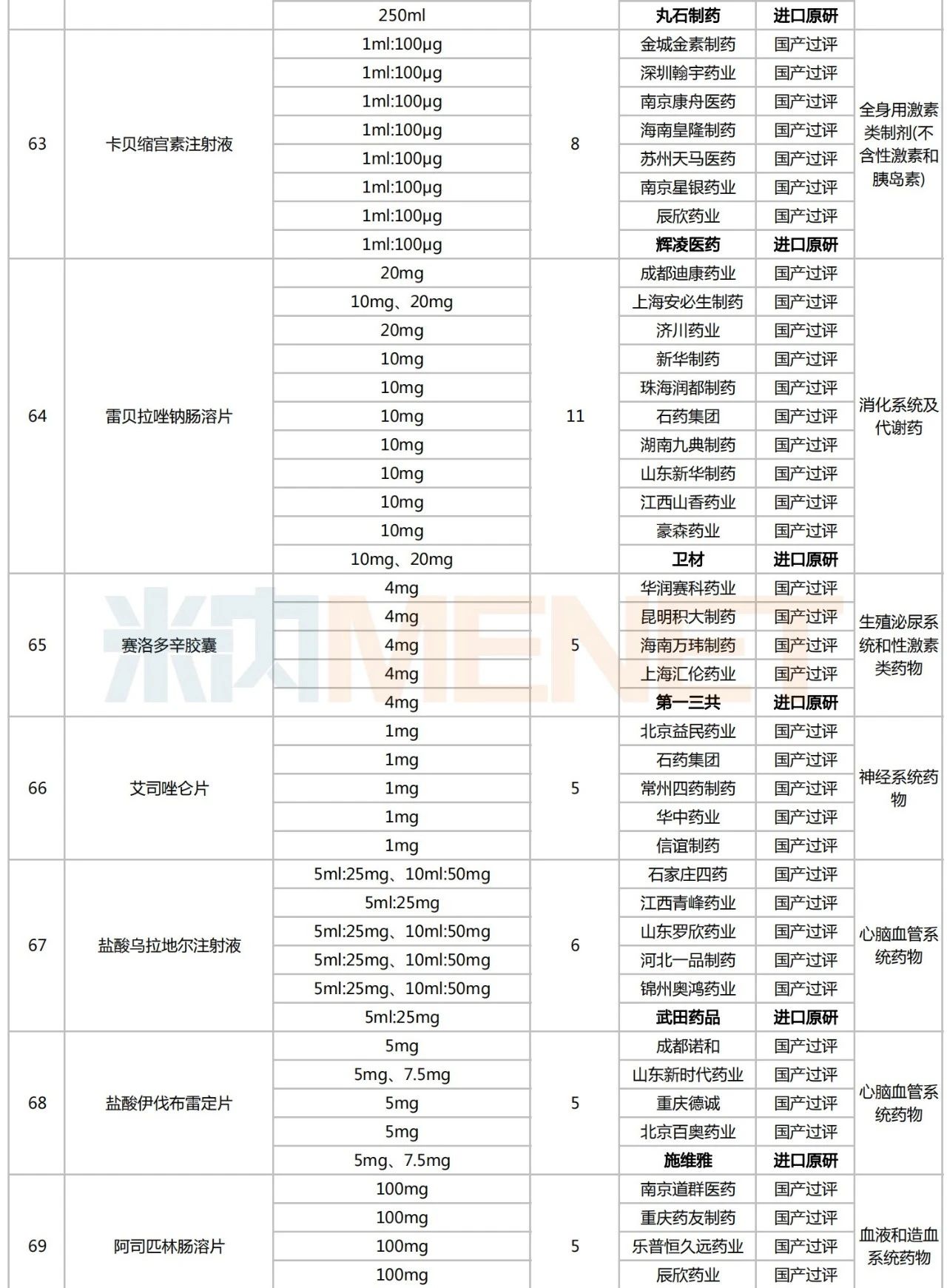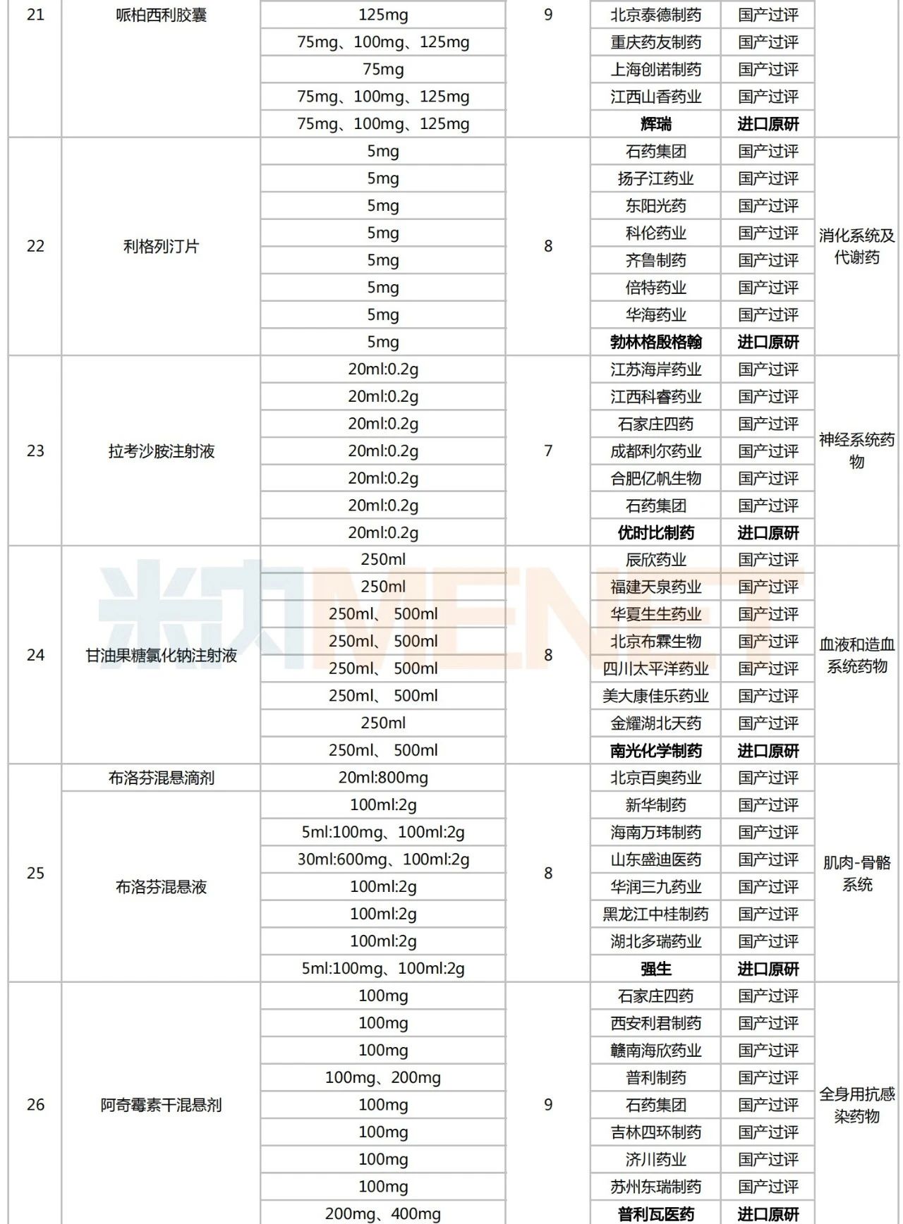 从治疗大类看,血液和造血系统药物为主力,有6个品种入围;全身用抗感染药物(5个)、心脑血管系统药物(4个)、消化系统及代谢药(3个)和呼吸系统用药(2个)紧随其后;肌肉-骨骼系统用药、抗肿瘤和免疫调节剂、以及生殖泌尿系统和性激素类药物则各有1个。