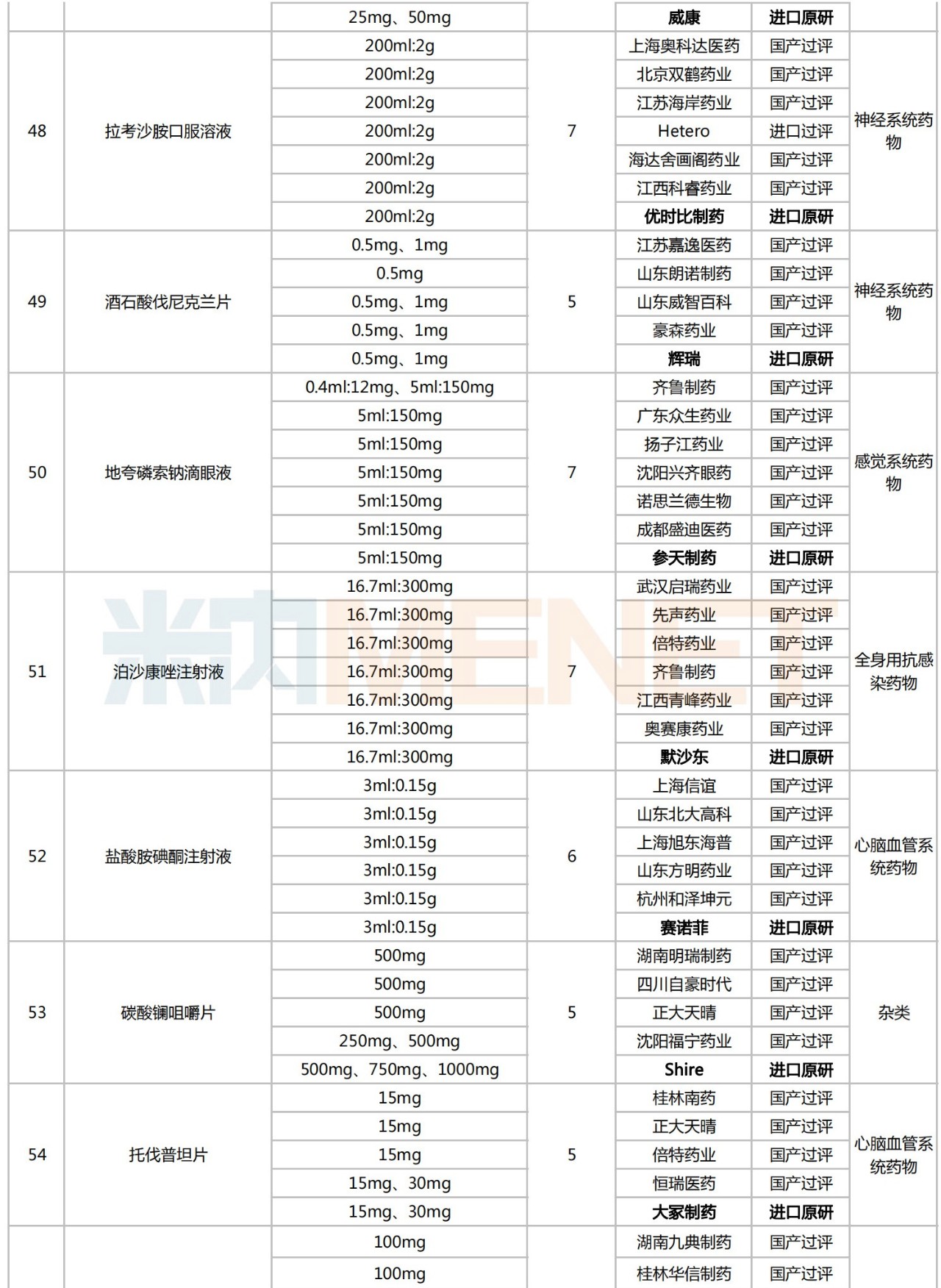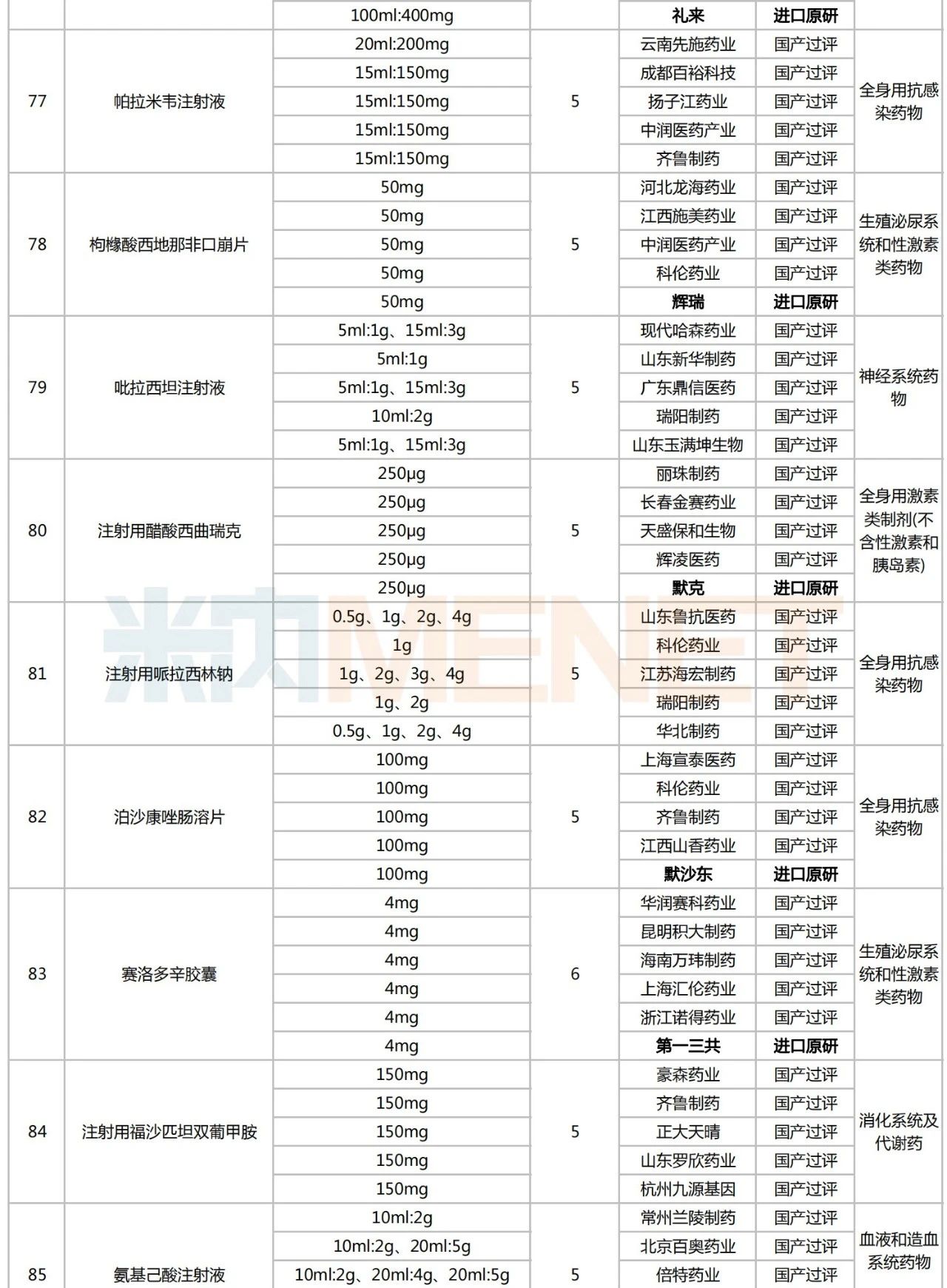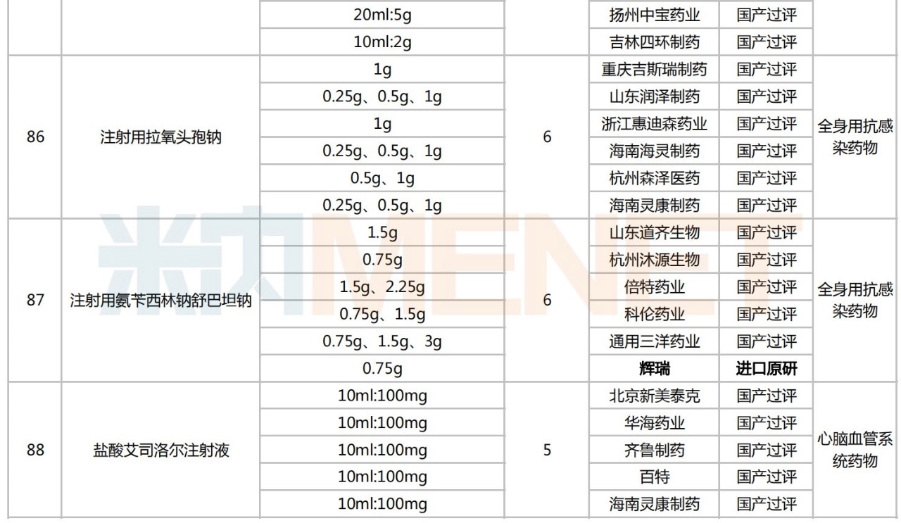 就目前情况看,化学药的竞争比较充分。截至8月18日,在未纳入国采的品种中至少有88个品种满足原研企业+过评企业≥5家的竞争格局,初步具备纳入国采的条件。注射剂仍为主力,不乏舒更葡糖钠注射液、注射用盐酸头孢替安、葡萄糖酸钙注射液、盐酸多巴胺注射液、氟维司群注射液等热门品种,涵盖心脑血管系统药物、全身用抗感染药物、消化系统及代谢药、抗肿瘤和免疫调节剂等多个治疗大类。