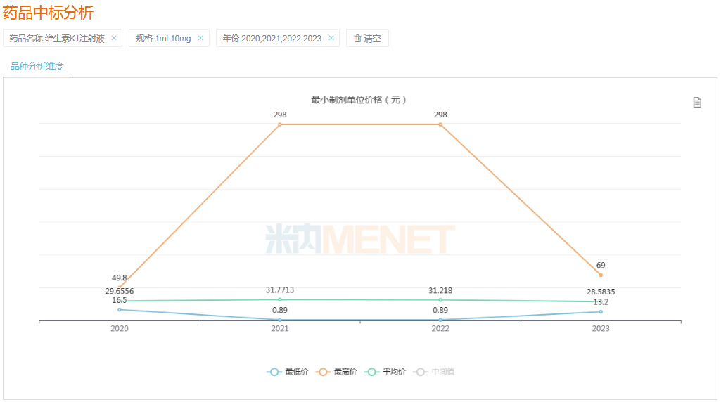 维生素K1注射剂是一种新生儿常用的维生素K补充剂,目前有倍特药业、国药集团、辰欣药业等13家企业拥有该药生产批文,其中倍特药业以仿制3类报产在审,获批即视同首家过评。从米内网药品中标情况分析,维生素K1注射液(1ml:10mg)2020年全国最高中标价为49.8元/支;随后2021-2022年,或受市场供需影响,该药全国最高中标价攀升至约298元/支。2023年8月,该药的全国最高中标价回落至69元/支,对广大患者而言显然是一大福音。
