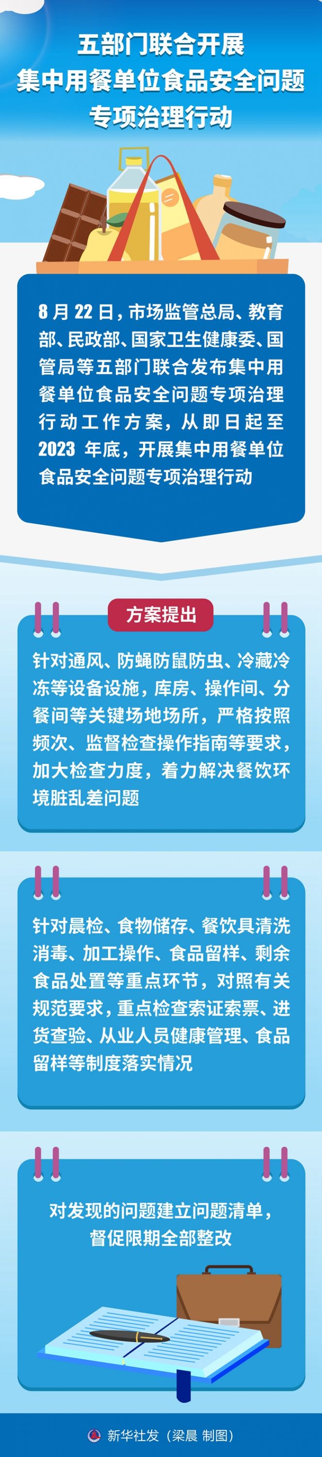 22日,市场监管总局、教育部、民政部、国家卫生健康委、国管局等五部门联合发布集中用餐单位食品安全问题专项治理行动工作方案,从即日起至今年年底,开展集中用餐单位食品安全问题专项治理行动。