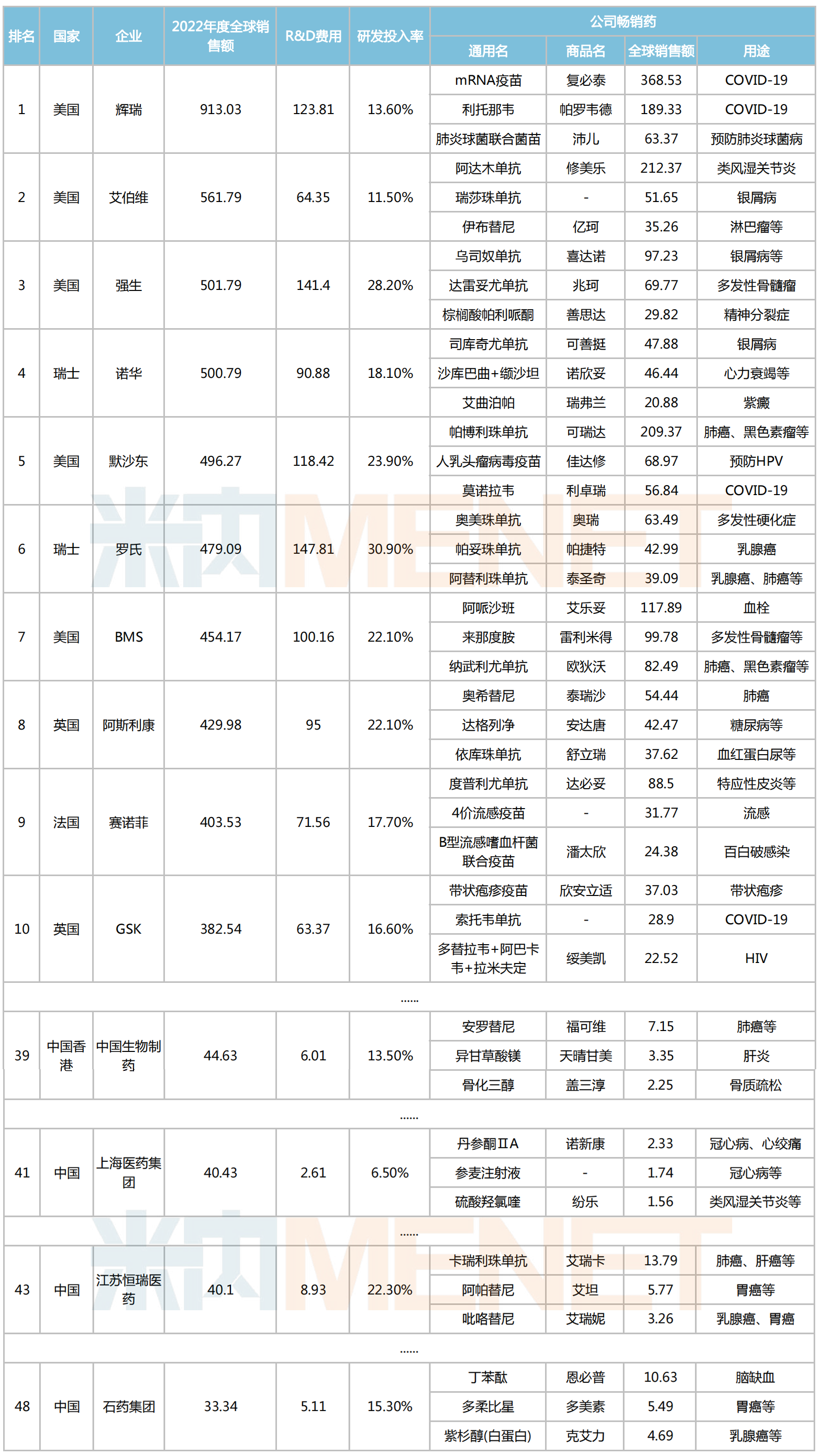 2023年全球制药企业TOP50(榜单部分)(单位:亿美元)