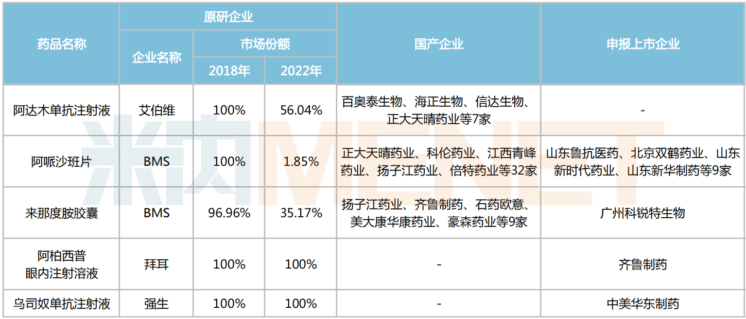比如,自2018年修美乐在国内获批以来,至今已迎来格乐立、泰博维、苏立信等7款国产生物类似药的冲击;艾乐妥更是与32个仿制产品同台竞技,原研厂商BMS在第三批国采中遗憾丢标,市场份额被进一步蚕食;瑞复美大部分专利已于2022年陆续到期,目前来那度胺胶囊已有9家国内企业获批上市、通过/视同通过一致性评价,并出现在日前发布的第九批国采信息填报药品名单中。