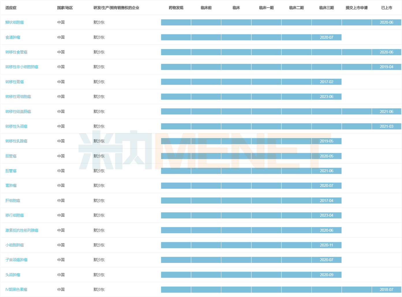 作为当红的抗肿瘤PD-(L)1单抗,K药一边守住肿瘤领域的细分市场,另一边在加速布局多项适应症及潜力靶点。米内网数据显示,目前该药已有接近40项适应症获批,覆盖黑色素瘤、非小细胞肺癌、淋巴瘤、肝癌等18个癌种;其中,在中国已获批鳞状细胞癌、转移性食管癌、转移性非小细胞肺癌、转移性结直肠癌、转移性头颈癌以及IV期黑色素瘤等6个适应症,处于临床试验及以上阶段的适应症达10个。
