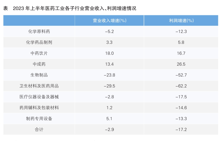 各子行业走势出现分化 化学药品制剂、中药饮片、中成药三个子行业营业收入、利润保持正增长,尤其是中药饮片、中成药,增速均达到两位数;辅料包材、制药设备两个子行业营业收入为正增长,但利润呈现负增长;化学原料药、生物制品、卫生材料及医药用品、医疗仪器设备及器械四个子行业营业收入、利润均为负增长。