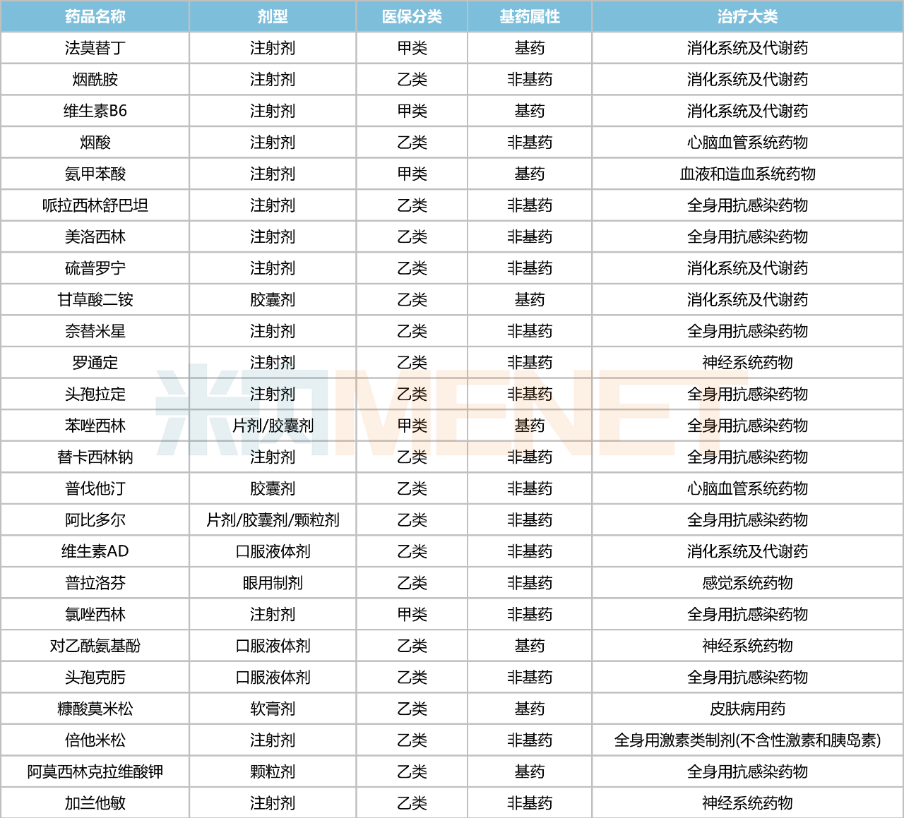 25个拟纳入集采的品种中,既有氨甲苯酸注射剂等被(曾被)纳入国家(省、市)短缺药目录的品种;也有法莫替丁注射剂、维生素B6注射剂、苯唑西林片剂/胶囊剂等同时纳入医保(甲类)和基药的临床常用药;亦有烟酰胺注射剂、烟酸注射剂、哌拉西林舒巴坦注射剂等2022年在中国城市公立医院、县级公立医院、城市社区中心以及乡镇卫生院(简称中国公立医疗机构)终端销售额超10亿元的重磅品种,以及加兰他敏注射剂、奈替米星注射剂、氯唑西林注射剂等销售额增速超300%的潜力明星药。