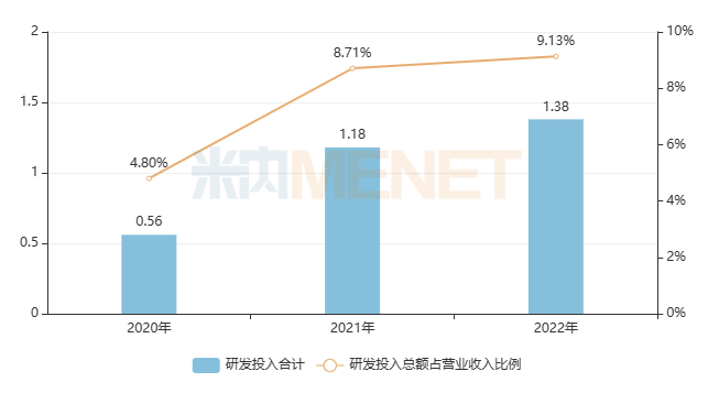 近几年葫芦娃药业的研发投入逐年攀升,据公司年报数据显示,2022年公司的研发投入合计达到了1.38亿元,占营收比例也攀升至9.13%。