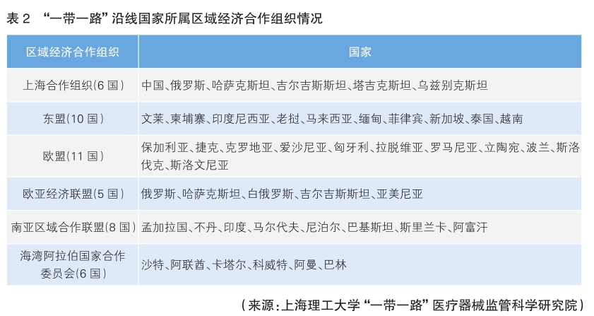 为促进经济贸易往来,大部分“一带 一路”沿线国家加入了所在区域的国际合作组织,以提高区域一体化程度,促进交流合作。这些组织包括上海合作组织、东盟、欧盟、欧亚经济联盟、南亚区域合作联盟、海湾阿拉伯国家合作委员会等(详见表2)。在医疗器械监管方面,部分区域合作组织制定了详细的法规或指令,统一了区域准入要求,如欧盟、东盟等。