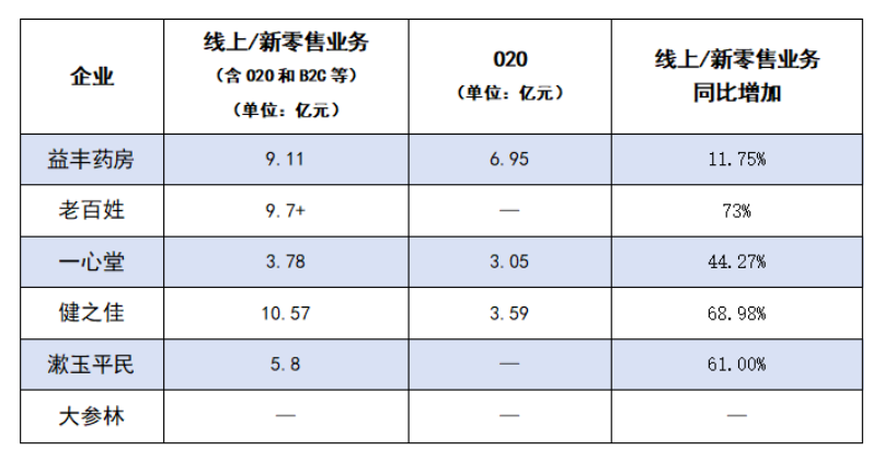 以老百姓、益丰、一心堂、健之佳、漱玉平民等几大头部连锁为例,财报数据显示,线上总营收分别为9.7+亿元、9.11亿元、3.78亿元、10.57亿元、5.8亿元,同比分别增长73%、11.75%、44.27%、68.98%、61%。(大参林未公布线上数据)