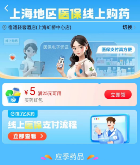 在上述两个外卖O2O平台,《医药经济报》新媒体中心记者发现,饿了么在购药页面设置了“上海地区医保线上购药”专区,点击可以看到线上医保支付流程以及可以使用医保支付购买的药品;美团购药页面显示,部分药店带有“医保”标注,在这些药店内购买带有“医保”字样的药品即可使用医保支付。