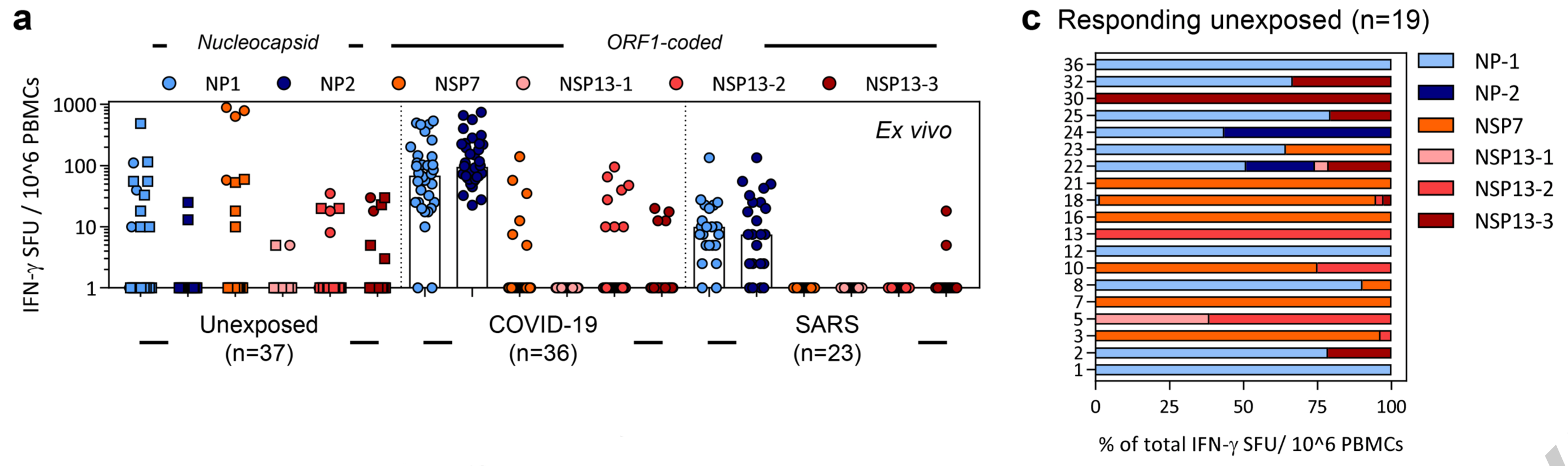 为了探索这种可能性,Bertoletti和他的同事又收集了37名未感染过SARS和新冠病毒的人的外周血单个核细胞,用新冠病毒的核衣壳蛋白(NP)、NSP7和NSP13处理。结果有19人的免疫细胞对新冠病毒有特异性的IFN-γ反应。