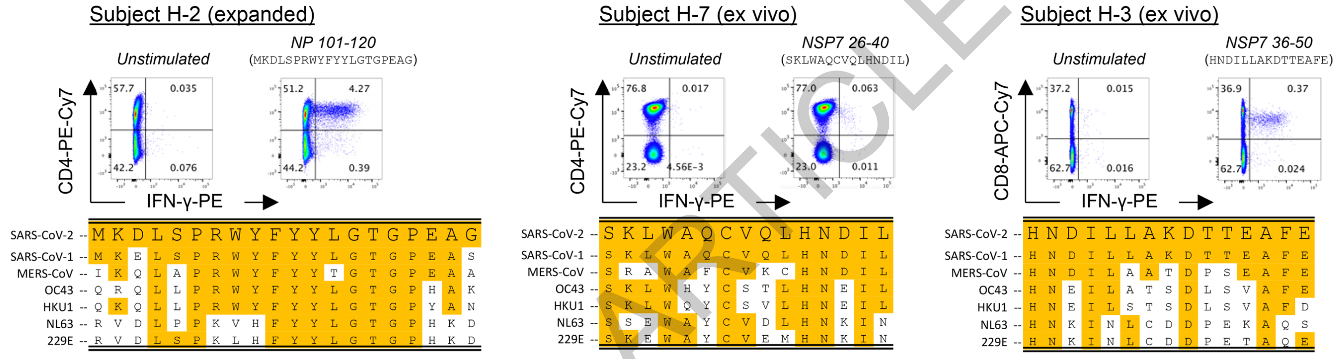 不仅如此,研究人员还探索了究竟是核衣壳蛋白(NP)、NSP7和NSP13的哪部分激活了T细胞。他们发现了对核衣壳蛋白(NP)101-120段和NSP7的26-40段有反应性的CD4+ T细胞,以及对NSP7的36-50段有反应性的特异性CD8+ T细胞。