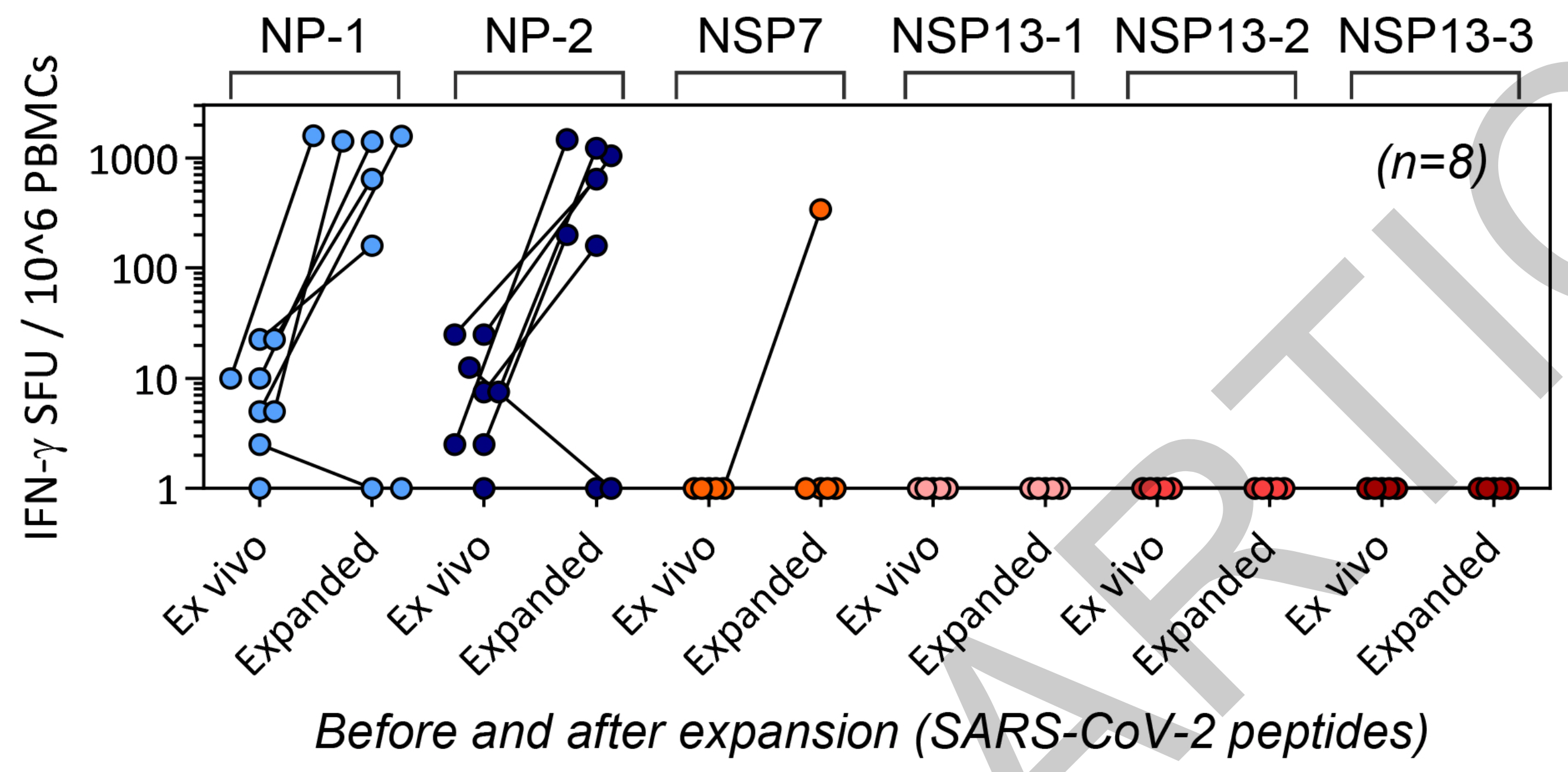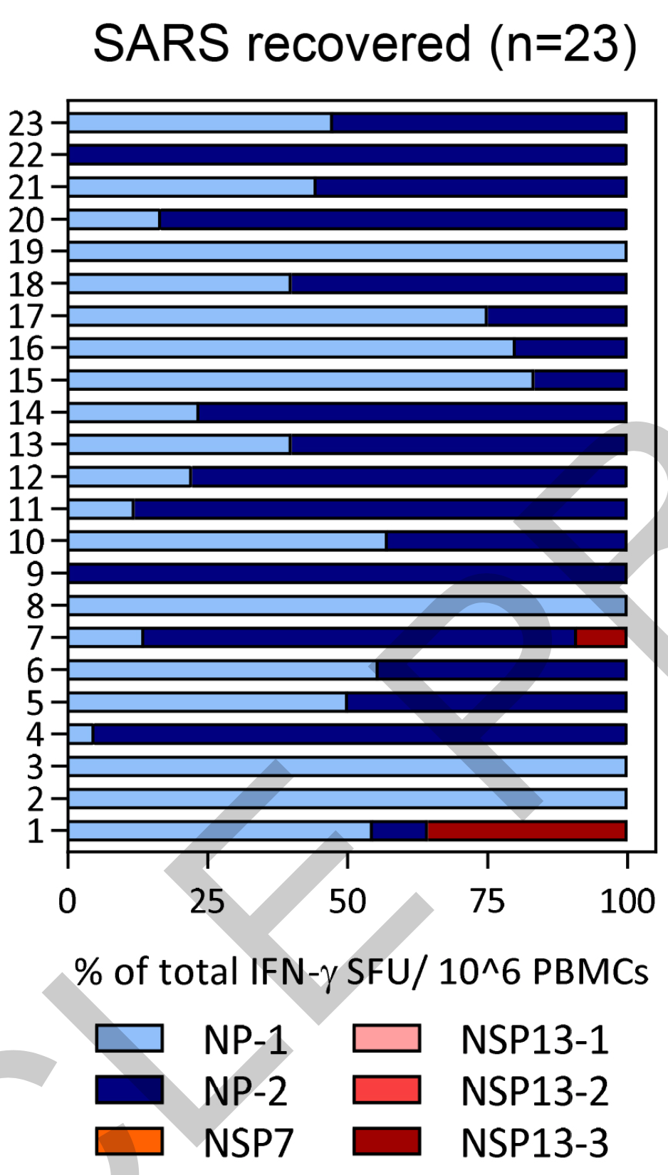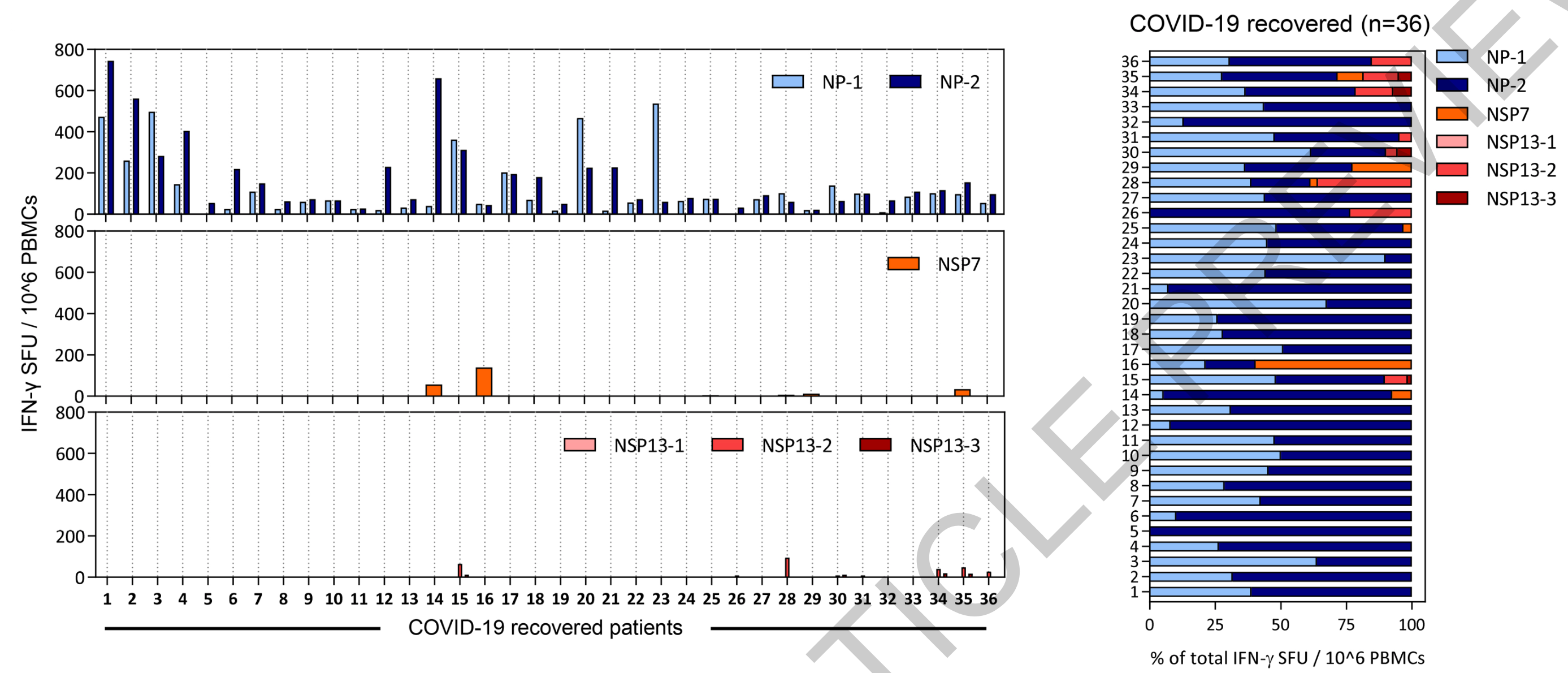 在核衣壳蛋白(NP)的刺激下,所有康复者的PBMC都会检测到IFN-γ,但是仅有12名康复者的PBMC对NSP7和NSP13有非常低水平的反应。