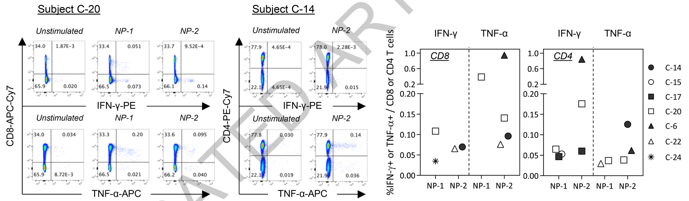 通过细胞因子染色技术,研究人员发现,能产生IFN-γ和/或TNF-α的细胞确实是CD4+和/或CD8+ T细胞群。