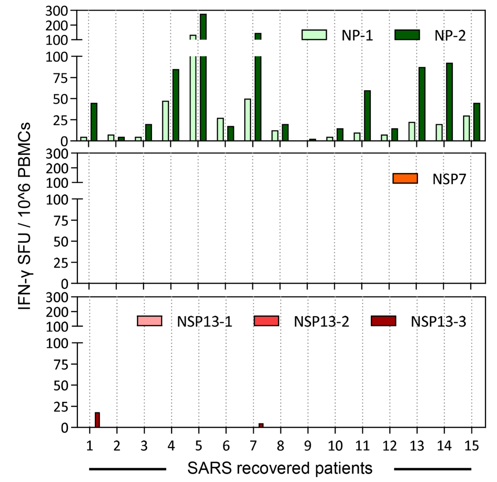 研究人员首先用SARS的NP、NSP7和NSP13的不同长度肽段,处理SARS康复者的外周血单个核细胞。结果让研究人员感到欣慰,在核衣壳蛋白(NP)的刺激下,所有康复者的外周血单个核细胞都产生了IFN-γ,而NSP7和NSP13几乎没有被识别。