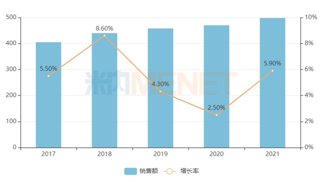 近5年中国城市实体药店终端慢病用药销售规模与增长率(单位:亿元)