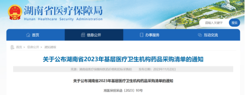 日前,湖南省医疗保障局官网发布《关于公布湖南省2023年基层医疗卫生机构药品采购清单的通知》(简称《通知》),自2023年12月1日起,全省各基层医疗卫生机构不得采购清单外药品。