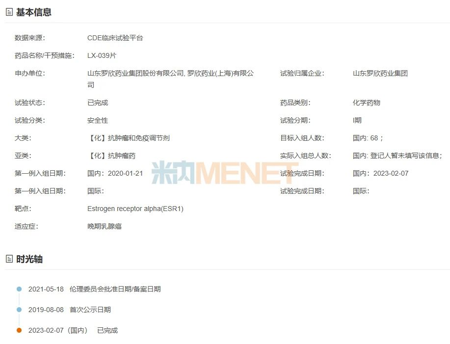 抗肿瘤1类新药LX-039片是罗欣药业自主研发的口服SERD(选择性雌激素受体下调剂),相比选择性雌激素受体调节剂和芳香化酶抑制剂表现出独特的药物优势。今年2月该新药晚期乳腺癌适应症的I期临床已完成,正计划进行II期临床试验。