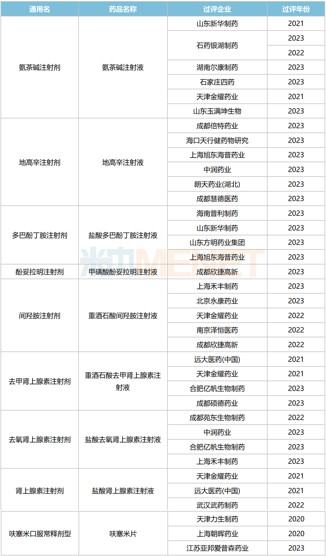 米内网数据显示,18个品种中有9个已有企业过评/视同过评,其中氨茶碱注射剂、地高辛注射剂过评企业数均达6家,间羟胺注射剂过评企业数达5家,多巴酚丁胺注射剂、去甲肾上腺素注射剂、去氧肾上腺素注射剂过评企业数均达4家,肾上腺素注射剂、呋塞米口服常释剂型过评企业数均达3家。