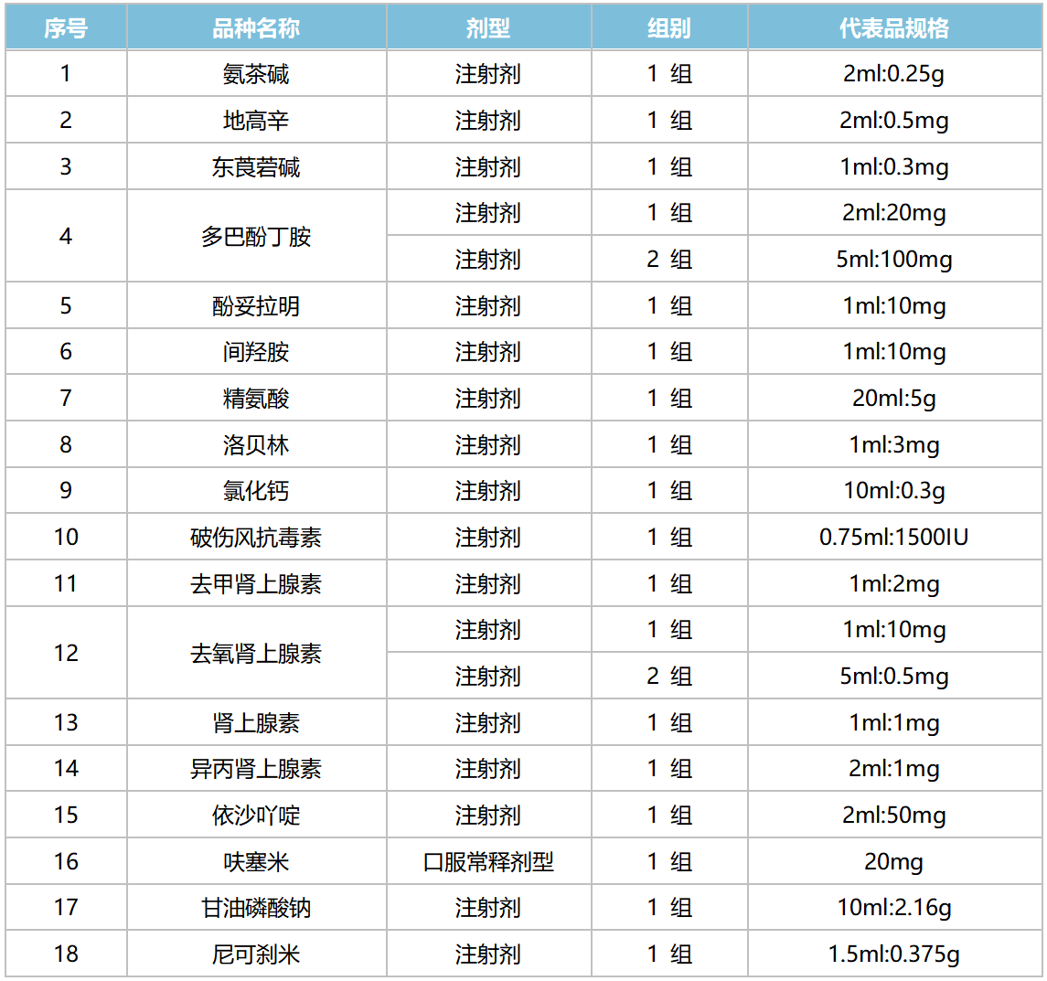 从剂型看,除了呋塞米口服常释剂型,其余17个品种均为注射剂;从治疗领域看,18个品种涵盖6个治疗大类,集中在心脑血管系统药物(9个)、呼吸系统用药(3个)等。