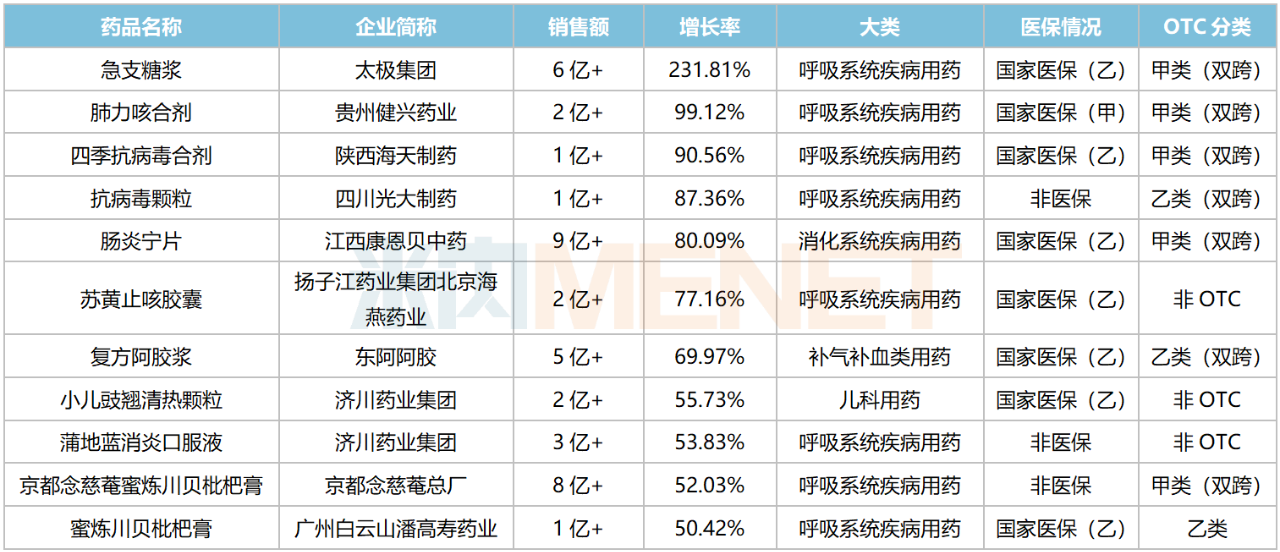 2023H1中国城市实体药店终端销售过亿的独家中成药