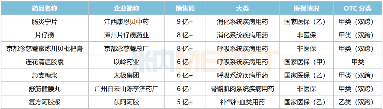 2023H1中国城市实体药店终端销售额超5亿元的独家中成药
