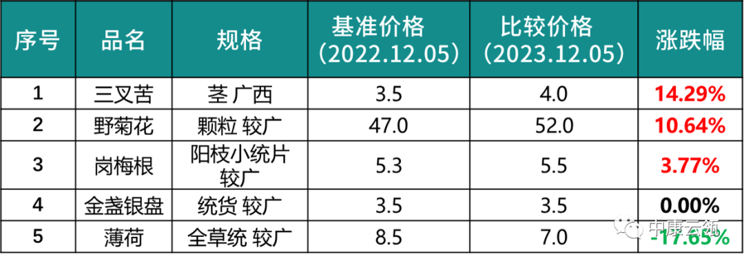 感冒灵颗粒核心原料在2022年12月-2023年12月期间,上涨品种3个,占比60%,走平品种1个,占比20%,下跌品种1个,占比20%。