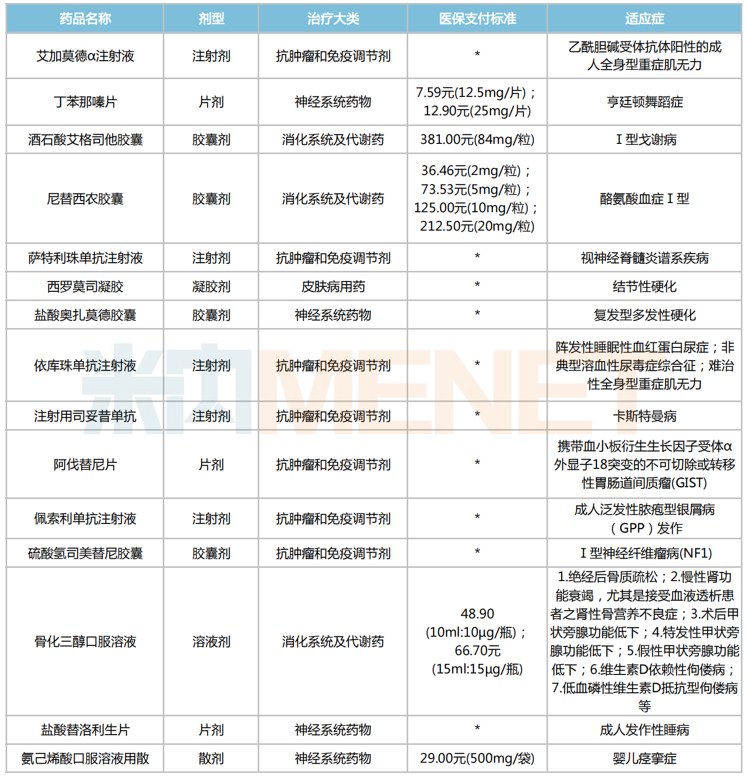 此外,新增进入医保目录的罕见病药还有:阿斯利康用于治疗阵发性睡眠性血红蛋白尿症、非典型溶血性尿毒症综合征、抗乙酰胆碱受体抗体阳性的难治性全身型重症肌无力的依库珠单抗注射液,以及用于Ⅰ型神经纤维瘤病的硫酸氢司美替尼胶囊;勃林格殷格翰用于成人泛发性脓疱型银屑病治疗的佩索利单抗注射液;BMS用于治疗成人复发型多发性硬化症的盐酸奥扎莫德胶囊;Argenx用于成人全身型重症肌无力治疗的艾加莫德α注射液;罗氏用于视神经脊髓炎谱系疾病