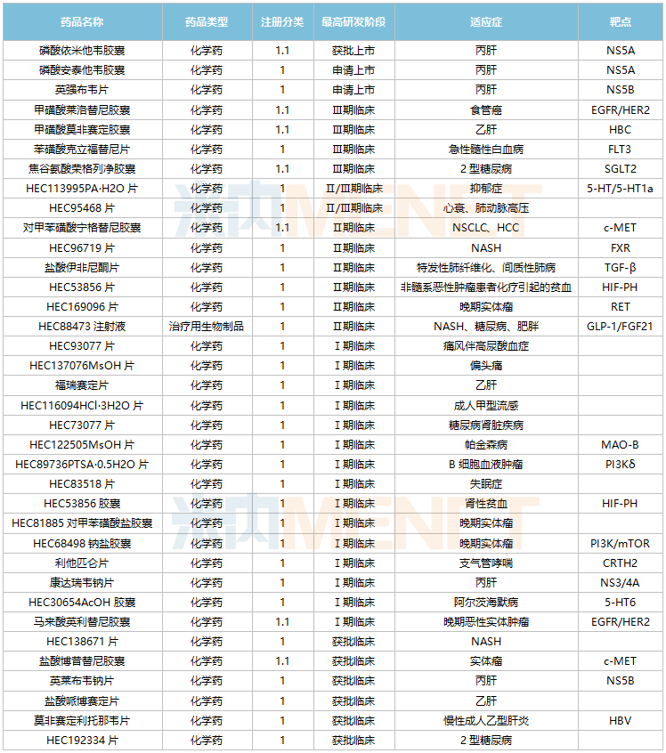 甲磺酸莱洛替尼胶囊(治疗食管癌)、甲磺酸莫非赛定胶囊(治疗乙肝)、苯磺酸克立福替尼片(治疗急性髓性白血病)、焦谷氨酸荣格列净胶囊(治疗2型糖尿病)等已处于Ⅲ期临床阶段,HEC113995PA·H2O片(治疗抑郁症)、HEC95468片(治疗肺动脉高压)均处于Ⅱ/Ⅲ期临床阶段,上市可期。