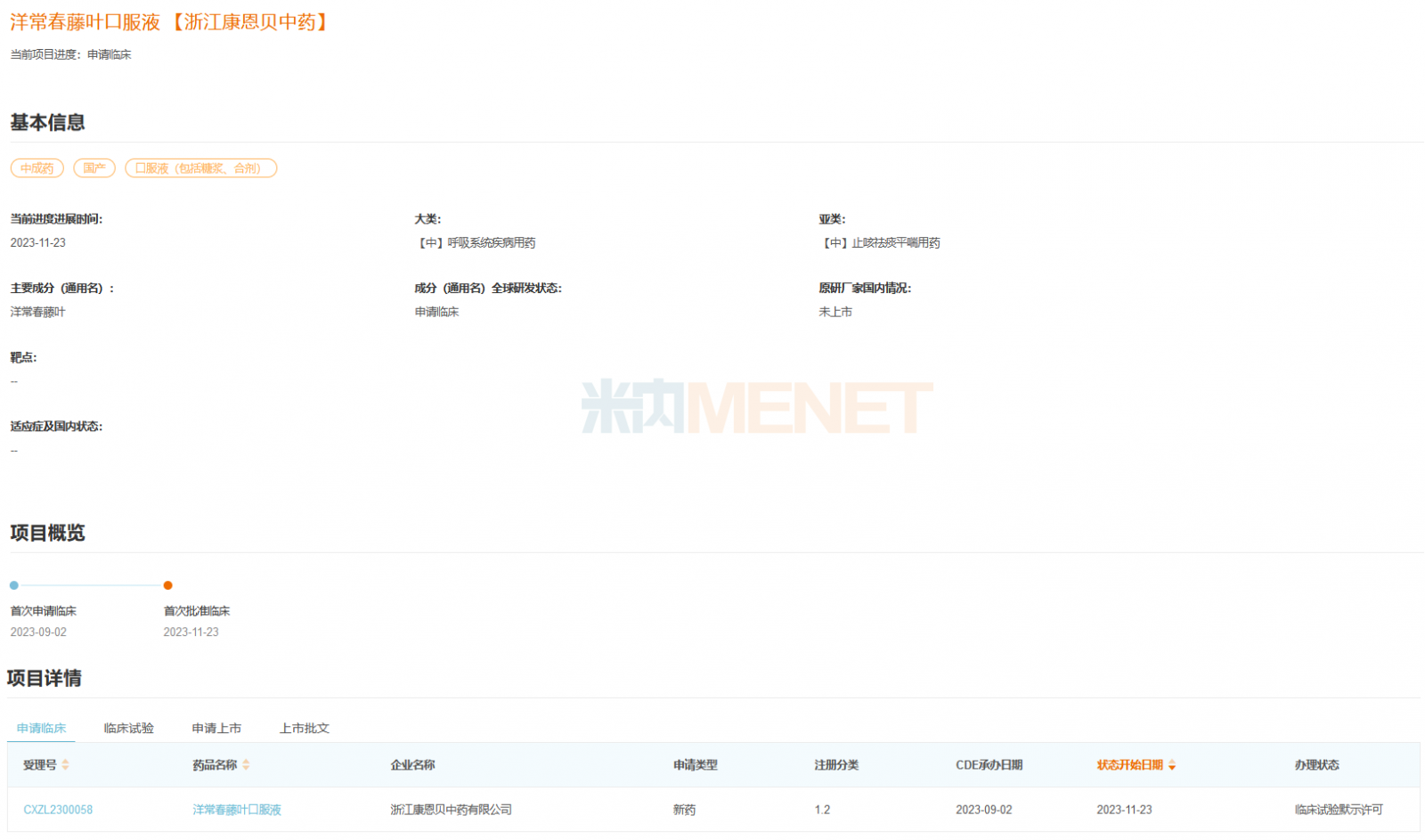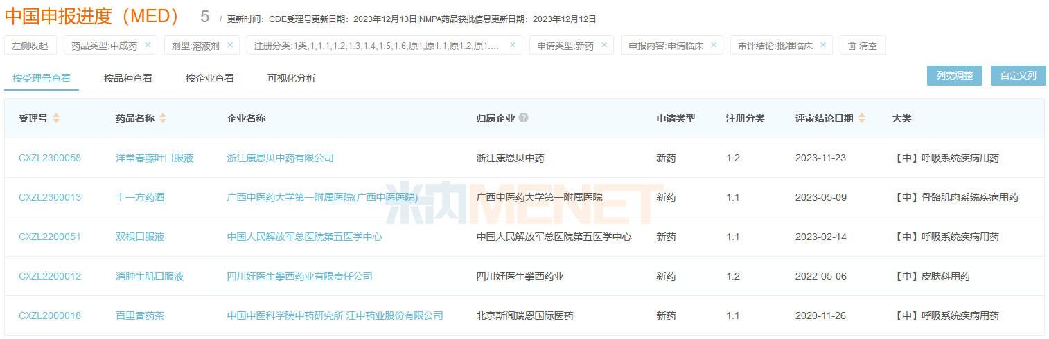 截至目前,中成药溶液剂1类新药获批临床共有5个,其中3个是呼吸系统疾病用药。