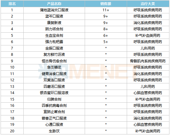产品TOP20中,蒲地蓝消炎口服液拿下“销冠”宝座,以超过11亿元的销售额领跑。从增速来看,四季抗病毒合剂、复方鲜竹沥液、急支糖浆、宣肺止嗽合剂、生脉饮5个产品翻倍。