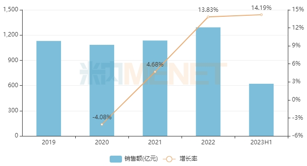 数据显示,近年来中国城市实体药店终端中成药销售规模均超过1000亿元,除了受疫情影响较大的2020年,其余年份均呈正增长态势,2022年其销售额超过1200亿元,2023上半年销售额增速创新高,约达14.2%。